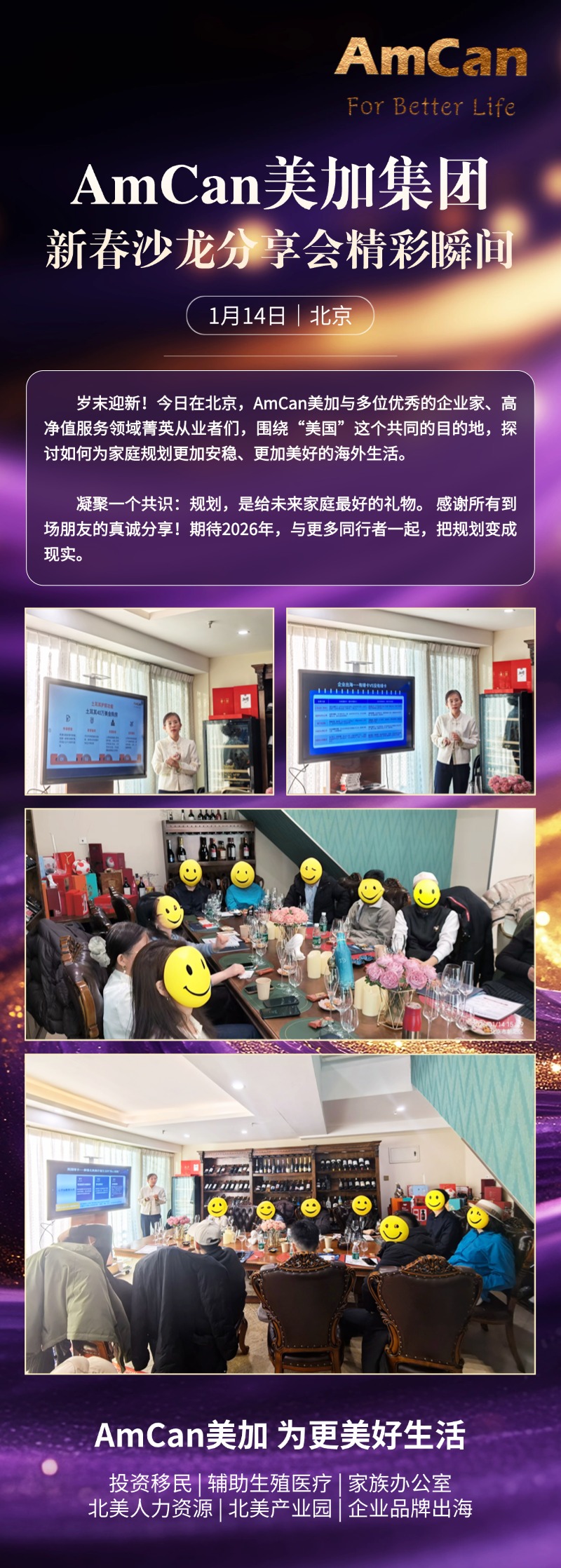 岁末迎新!今日在北京,AmCan美加与多位优秀的企业家、高净值服务领域菁英从业者们,围绕“美国”这个共同的目的地,探讨如何为家庭规划更加安稳、更加美好的海外生活。