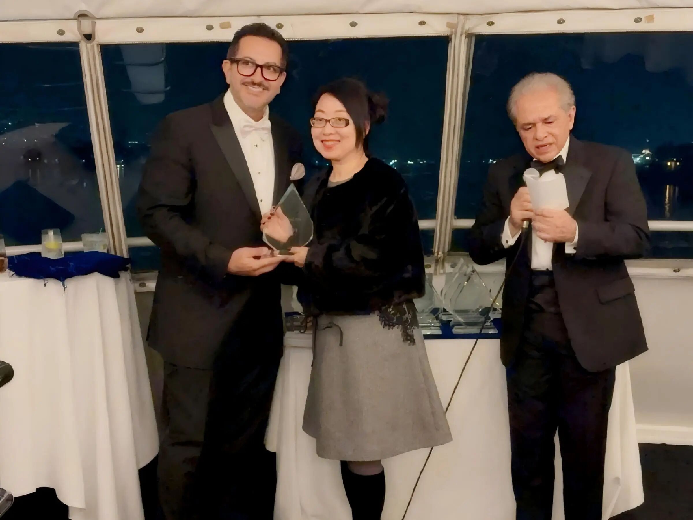 AmCan集团CEO Kristine李女士代表AmCan集团,在新港湾的豪华游艇晚宴的颁奖典礼上,接受由EB-5大会主席Ali和EB-5知名律师Ozzie颁发的全球顶级25个移民机构的奖杯