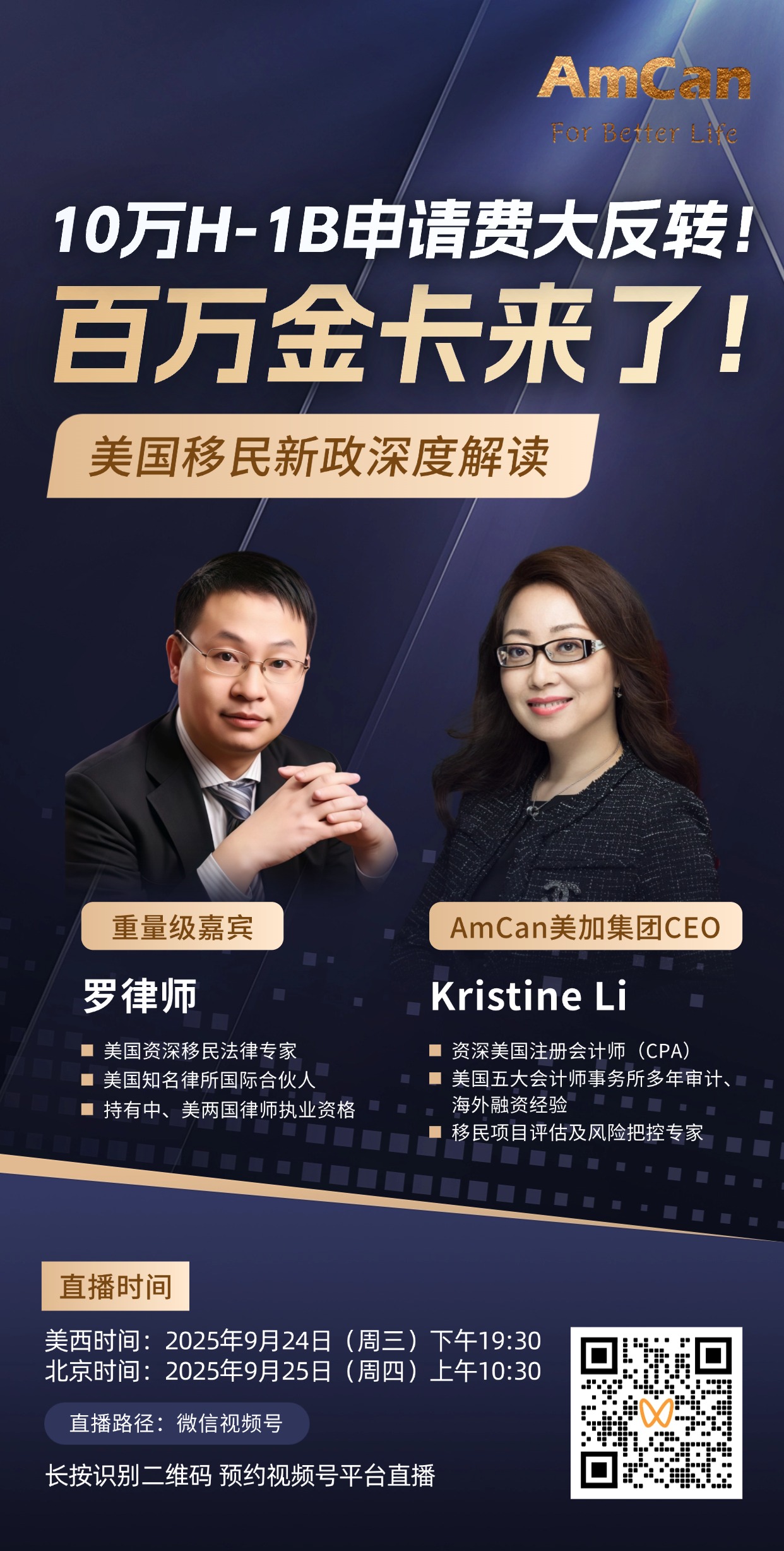 北京时间9 月 25 日上午,AmCan 美加集团举办的美国移民新政解读直播活动收获热烈反响。本次直播特邀美国资深移民法律专家罗律师,以及 AmCan 美加集团CEO、资深美国注册会计师(CPA)Kristine Li,为关注美国移民的观众带来满满干货。